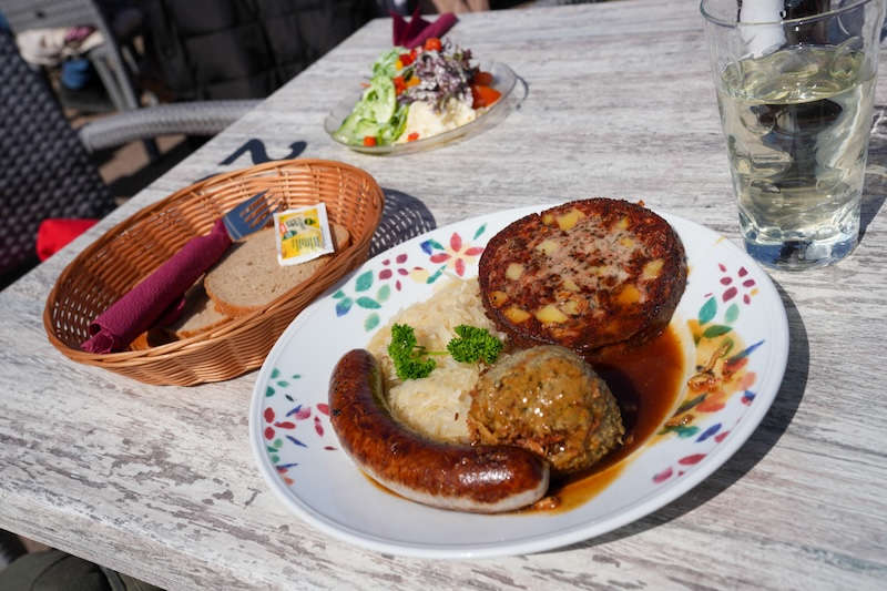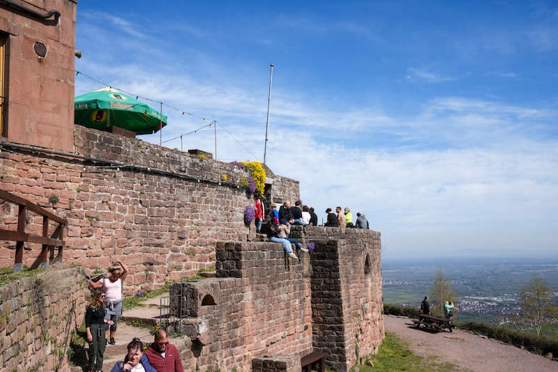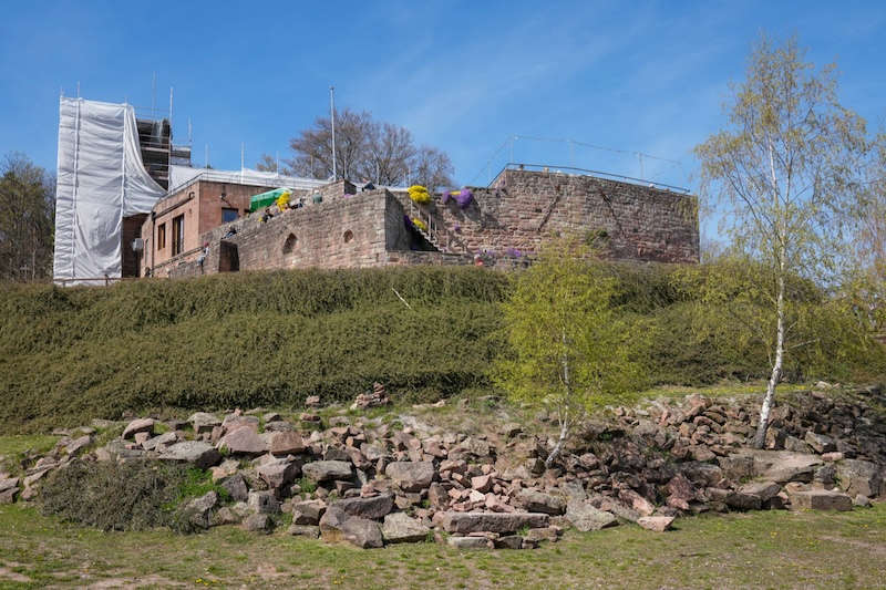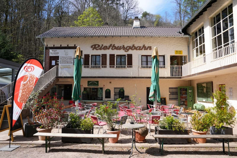 Oben angekommen, stand zunächst die Einkehr in der Höhengaststätte auf dem Programm. Mit rund 90 Sitzplätzen im Innenbereich und etwa 120 Plätzen im Freien bietet sie ausreichend Raum für Wanderer und Ausflügler. Bei einer herzhaften Rietburgplatte und einem Glas Rieslingschorle ließ sich der Blick über die Rheinebene besonders genießen.