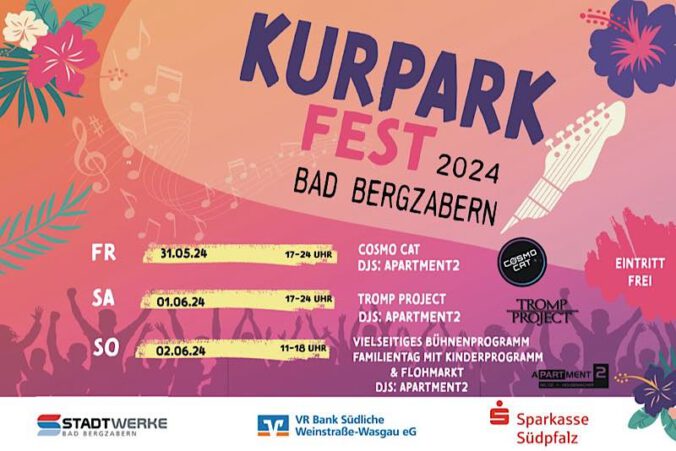 Bad Bergzabern – Der Tourismusverein Südliche Weinstraße Bad Bergzabern lädt Sie herzlich zum Kurparkfest vom 31. Mai bis 02. Juni 2024 ein.