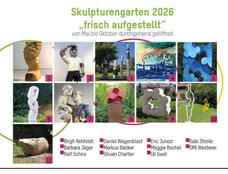 Der Skulpturengarten in Schweigen-Rechtenbach ist auch für diese Saison „frisch aufgestellt“. In der öffentlich zugänglichen Ausstellung sind Jahr für Jahr durch Gudrun Zoller aufmerksam kuratierte Skulpturen von Künstlerinnen und Künstlern aus nah und fern zu sehen. In dieser Saison, die von Mai bis Oktober geht, werden Werke von Birgit Rehfeldt, Daniel Wagenblast, Eric Junod, Gabi Streile, Barbara Jäger, LILAU, Meggie Rochell, OMI Riesterer, Ralf Schira, Silvain Chartier und Uli Gsell zu sehen sein. Die jährlich wechselnden Ausstellungen im Gemeindepark Schweigen-Rechtenbach sind schon seit vielen Jahren ein Ort der Begegnung mit Skulptur. Arbeiten aus Holz, Stein, Keramik und Stahl – insgesamt mehr als 20 großformatige Skulpturen und Objekte – verwandeln den Park in eine Open Air-Galerie.