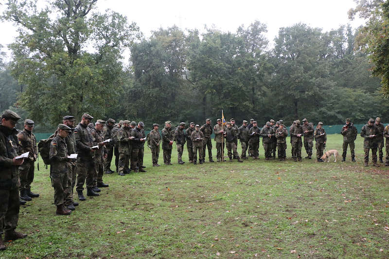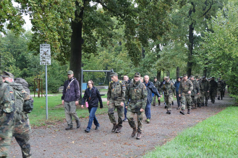 Die diesjährige Wallfahrt im Jahr der Hoffnung begann mit dem Reisesegen und einem Gebet aus dem Psalm 8 „Unter Gottes Schutz“, welcher durch den Pastoralreferent Thomas Stephan und dem leitenden Militärdekan Artur Wagner aus München gespendet wurde. Vor dem Abmarsch bekam jeder von den über 60 Teilnehmerinnen und Teilnehmer wie auch in den Jahren zuvor, ein Gesangbuch und ein von Hand angefertigtes Holzkreuz. Der Kommandeur des Verbandes, Oberstleutnant Christian Zerau, ließ es sich nicht nehmen, die Pilger auf dem Marsch zu begleiten und die Gruppe anzuführen. Während des 15 Kilometer langen Marsches durch den Bellheimer Wald wurde an verschiedenen Punkten ein Stopp eingelegt und eine kurze Andacht durchgeführt. Trotz zeitweisem Regenschauer war die Stimmung in der Marschgruppe sehr gut und man tauschte sich über die verschiedensten Themen aus.