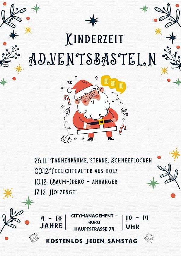 Die Kinderzeit findet jeden Adventssamstag von 10:00 bis 14:00 Uhr im Büro des Citymanagements in der Hauptstraße 74 statt.