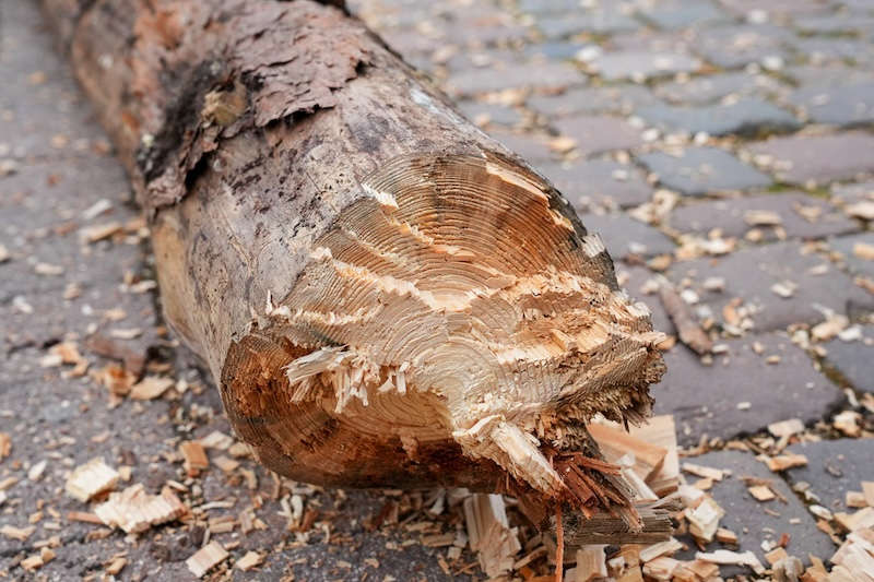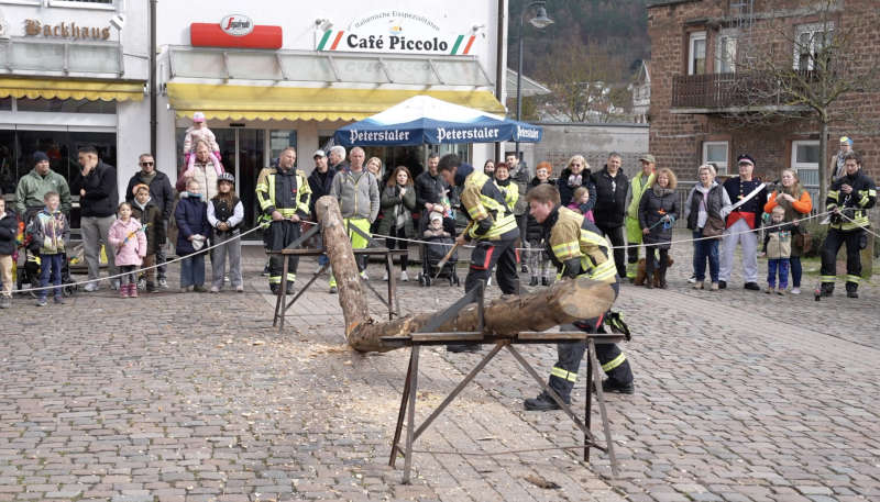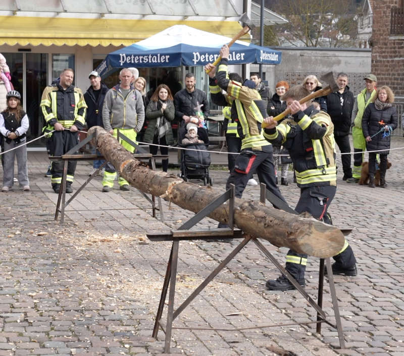 Danach setzte sich ein kleiner Umzug, geführt von Büttel Markus Kern, vom Grundschulhof über die Schulstraße zur Friedrich-Ebert-Brücke in Bewegung. Dort war bereits der Holzstamm für das traditionelle Stammhacken vorbereitet.