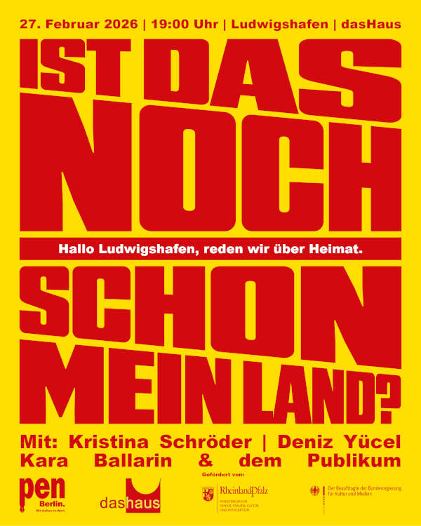 Ludwigshafen – Am Freitag, 27.02.2026, um 19 Uhr ist die Schriftstellervereinigung PEN Berlin zum Auftakt ihrer Rheinland-Pfalz-Gesprächsreihe zum Thema Heimat mit PEN-Sprecher Deniz Yücel und der ehemaligen Bundesfamilienministerin Kristina Schröder, moderiert von Kara Ballarin, im Kulturzentrum dasHaus, Veranstaltungsraum Dôme, Bahnhofstr. 30, 67059 Ludwigshafen zu Gast.