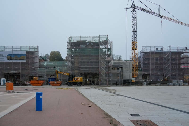 Im Rahmen des Umbaus werden unter anderem die Dächer und der historische Kamin des 1866 errichteten Empfangsgebäudes modernisiert. Derzeit bauen die Fachleute voraussichtlich noch bis zum Ende des Jahres die Dacheindeckung zurück.