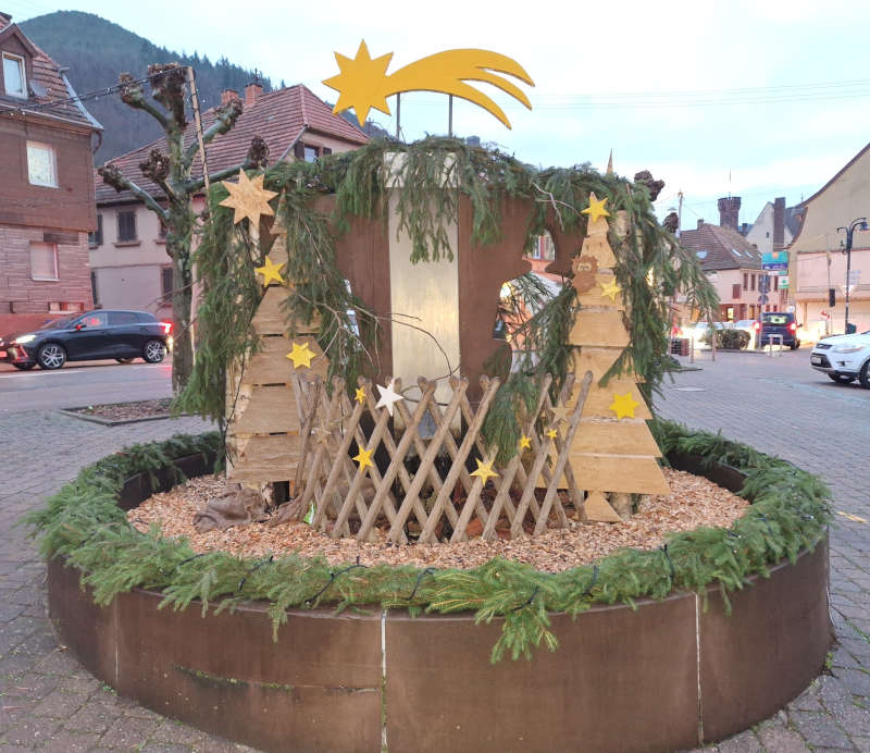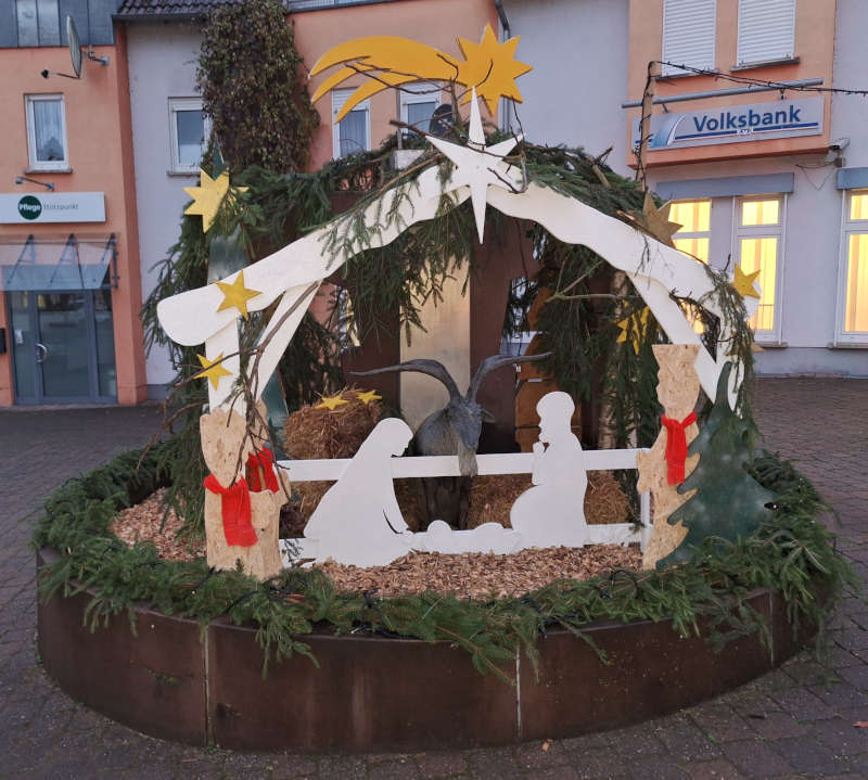Lambrecht – Die FWG Lambrecht & friends haben auch in diesem Jahr den Gäsbockbrunnen auf dem Herzog-Otto-Platz in Lambrecht in einen Winterbrunnen verwandelt. Bernhard Pfeifer hat nach den kreativen Ideen von Susanne Klumpp die Krippe in Handarbeit hergestellt und den Gegebenheiten des Brunnens angepasst. Dargestellt wird die Geschichte im Stall von Bethlehem.