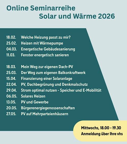 Grünstadt – Der Klimaschutz der Verbandsgemeinde Leiningerland organisiert eine Vortragsreihe zum Thema Solar und Wärme mit. Die Termine finden von Februar bis Mai 2026 online statt.
