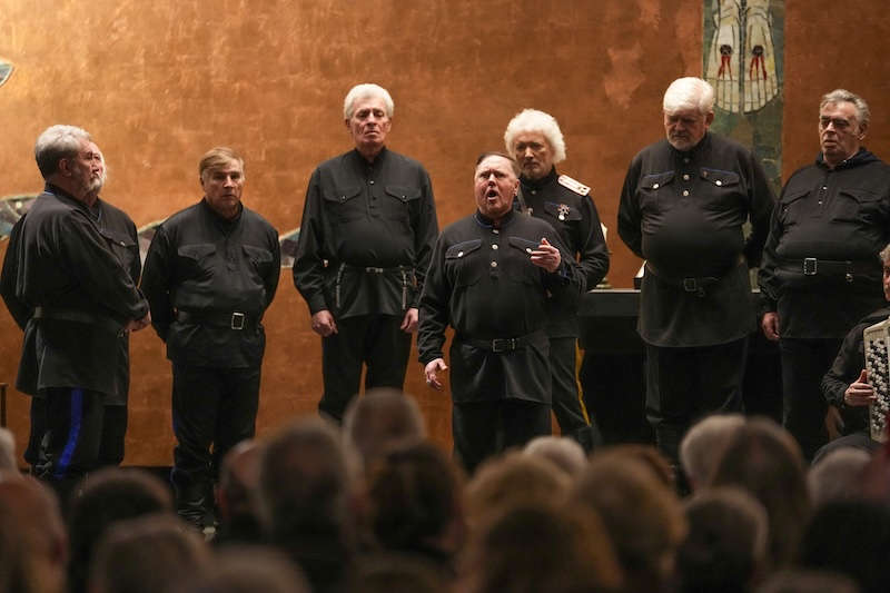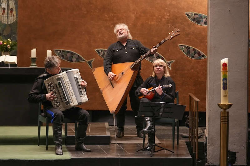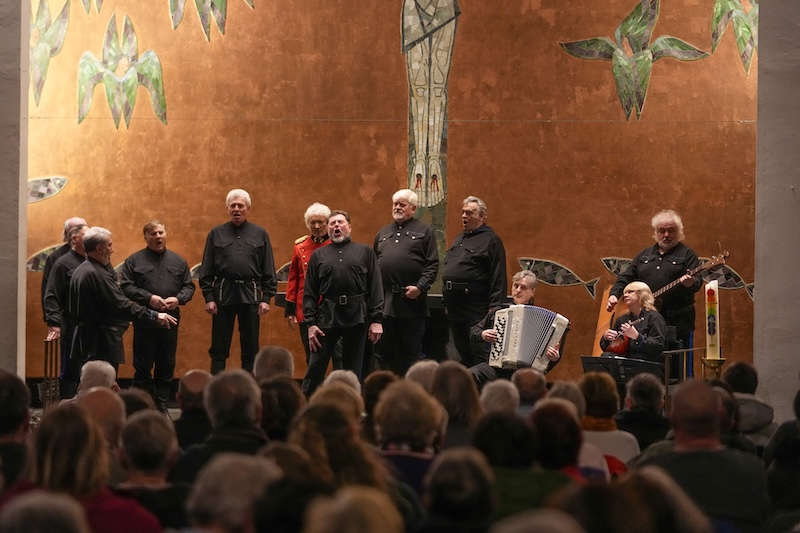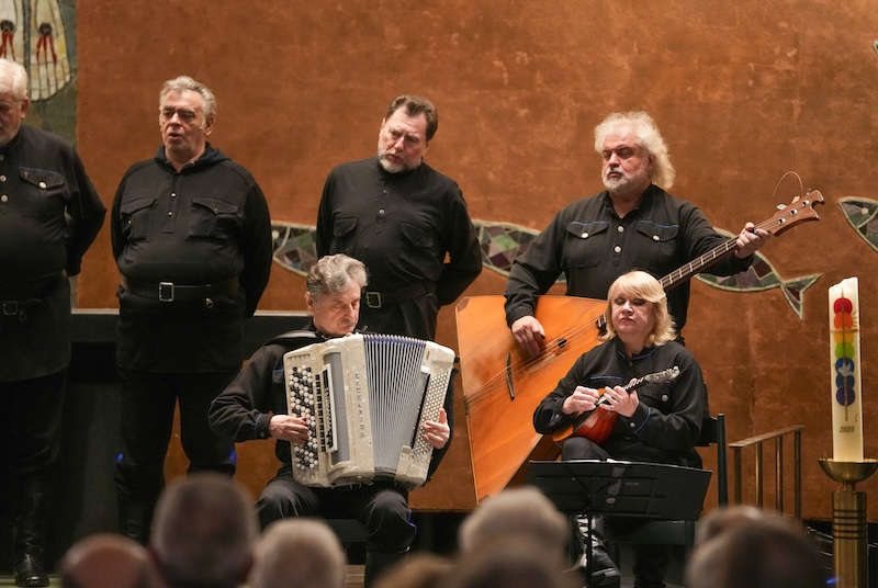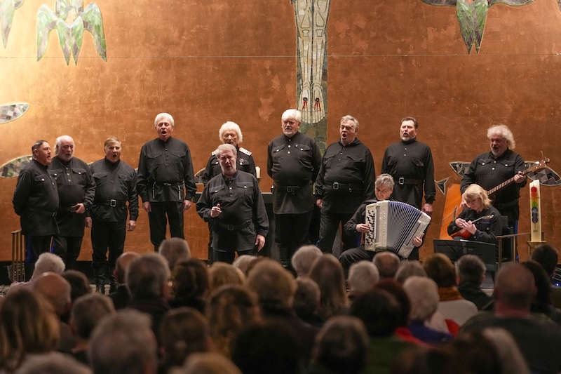 Auch in Ludwigshafen führte der charismatische Leiter „seinen“ Chor, ein 12-köpfiges Ensemble mit neun Sängern und drei Instrumentalisten, mit sicherer Hand durch ein Programm, das geistliche Gesänge, klassische Kosakenlieder und bekannte Volksweisen vereinte. Die mächtigen Bässe, getragen von warmen Bariton- und Tenorstimmen, füllten den Kirchenraum und nutzten die Akustik der Friedenskirche eindrucksvoll aus.