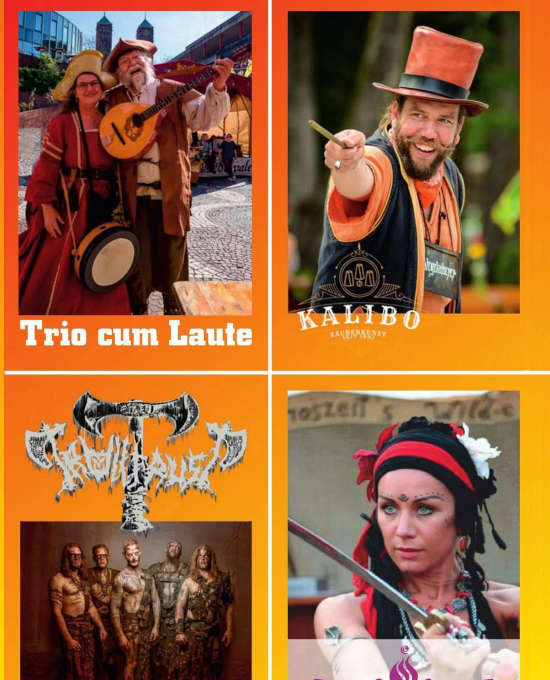 Für den musikalischen Top-Act der Veranstaltung sorgt am Samstagabend ab 20 Uhr die Mittelalter-Live-Band “Trollfaust“. An allen drei Tagen wird das „Trio Cum Laute“ die Besucher mit mittelalterlicher Musik unterhalten. Darüber hinaus können sich die Besucher noch auf die Tänzerinnen von „Shabana Atesh“ und auf eine Feuershow mit der Feuermaid „Urmen“ freuen. Erstmals mit dabei ist eine Schwertkampftruppe der Akademie Langen, ebenfalls an allen Tagen ihre Künste vorführen wird. Ein ganz besonderes Highlight erwartet die Besucher mit dem Auftritt von Zauberkünstler „Kalibo“. Als „Der Wegelaberer“ ist Kalibo seit über zwei Jahrzehnten auf Mittelaltermärkten und historischen Festen in ganz Deutschland legendär und bereits mehrfach mit Preisen ausgezeichnet worden.