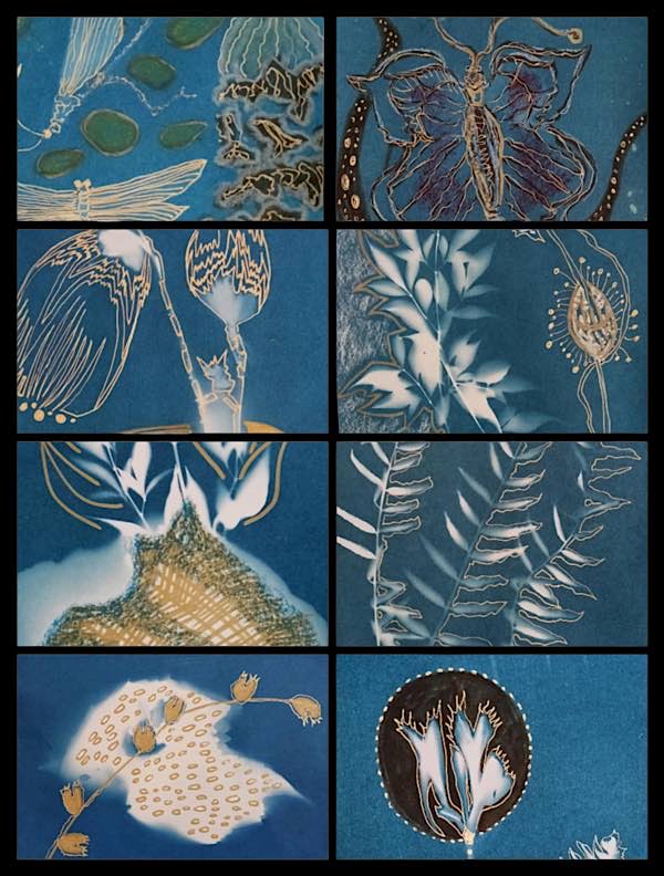 Auch ein tolles Objekt teilweise aus Seide in besonderer Verarbeitung erinnert an die Cape Cobra zwischen interessanten Cyanotypien. Üppige Malerei bringt Wärme in den Winter Blues.