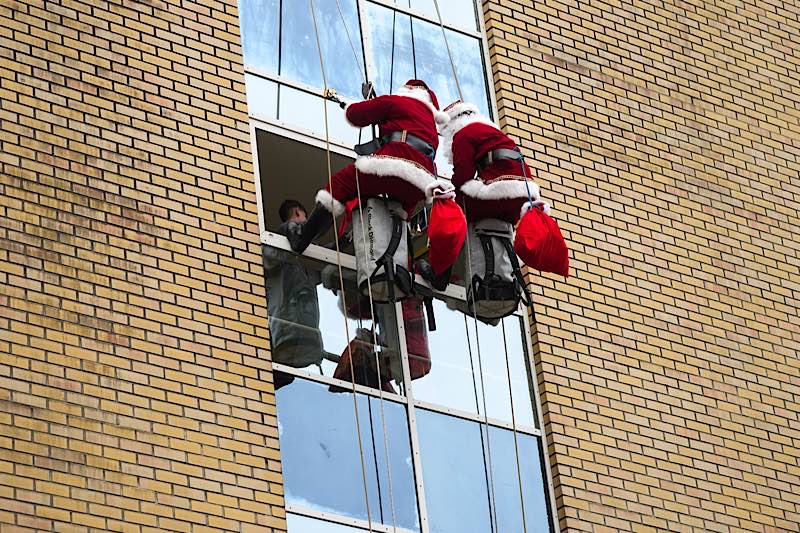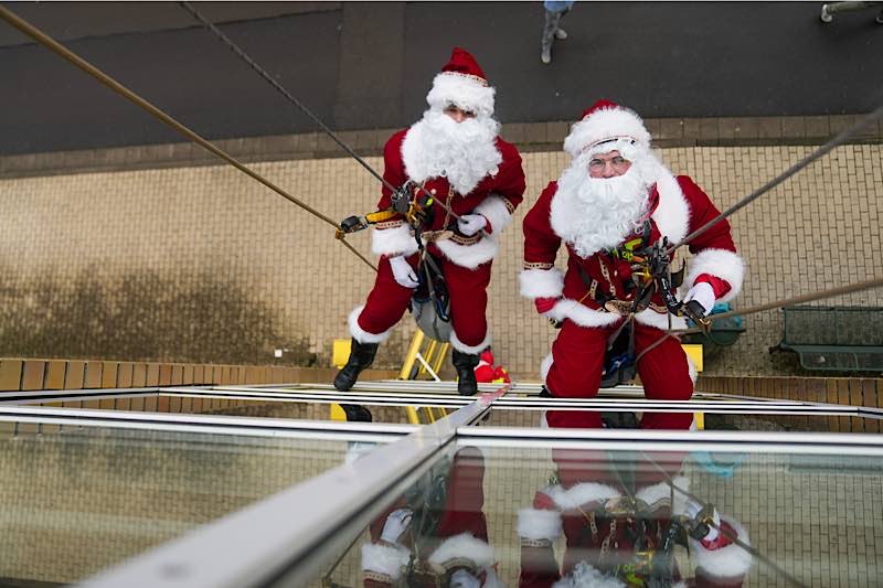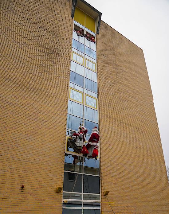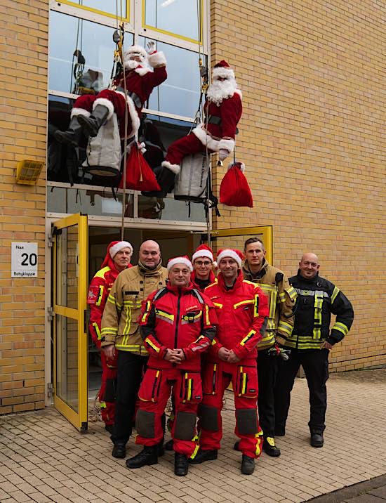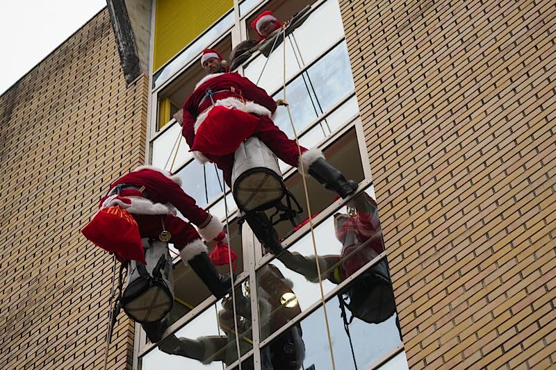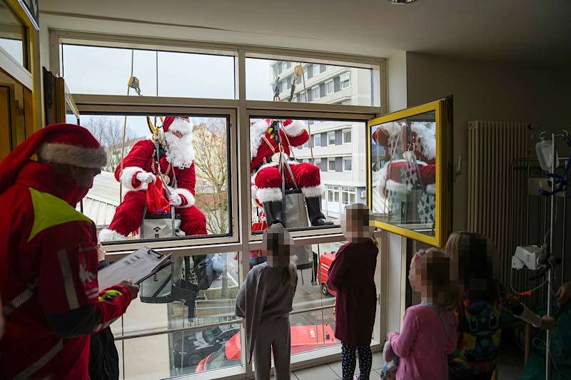Jetzt war der große Moment gekommen: Aus den beiden Fenstern des obersten Treppenhausstockwerks ließen sich zwei als Nikolaus verkleidete Höhenretter ab – gut gesichert, professionell ausgerüstet und mit einem kräftigen „Ho, ho, ho!“ versehen.